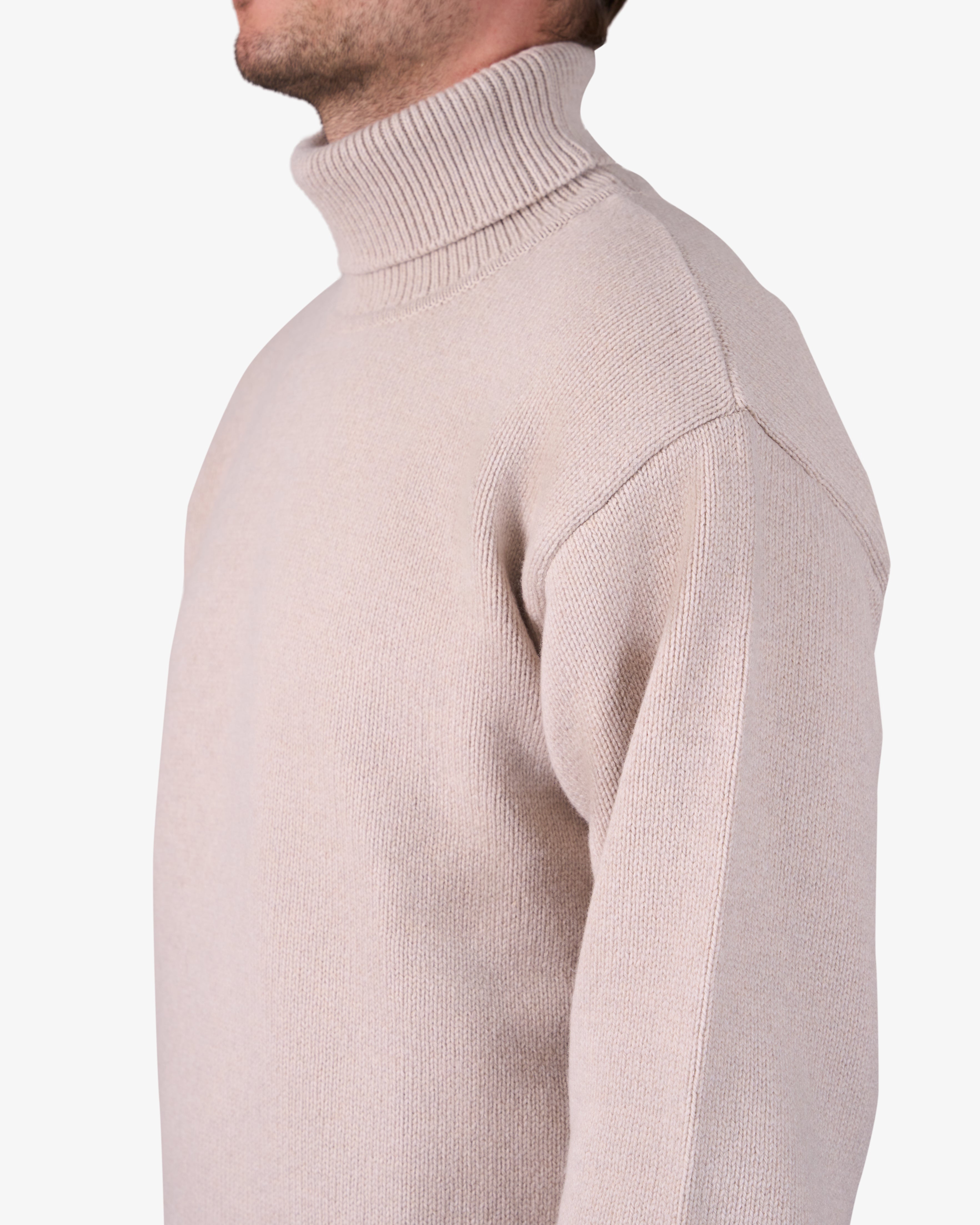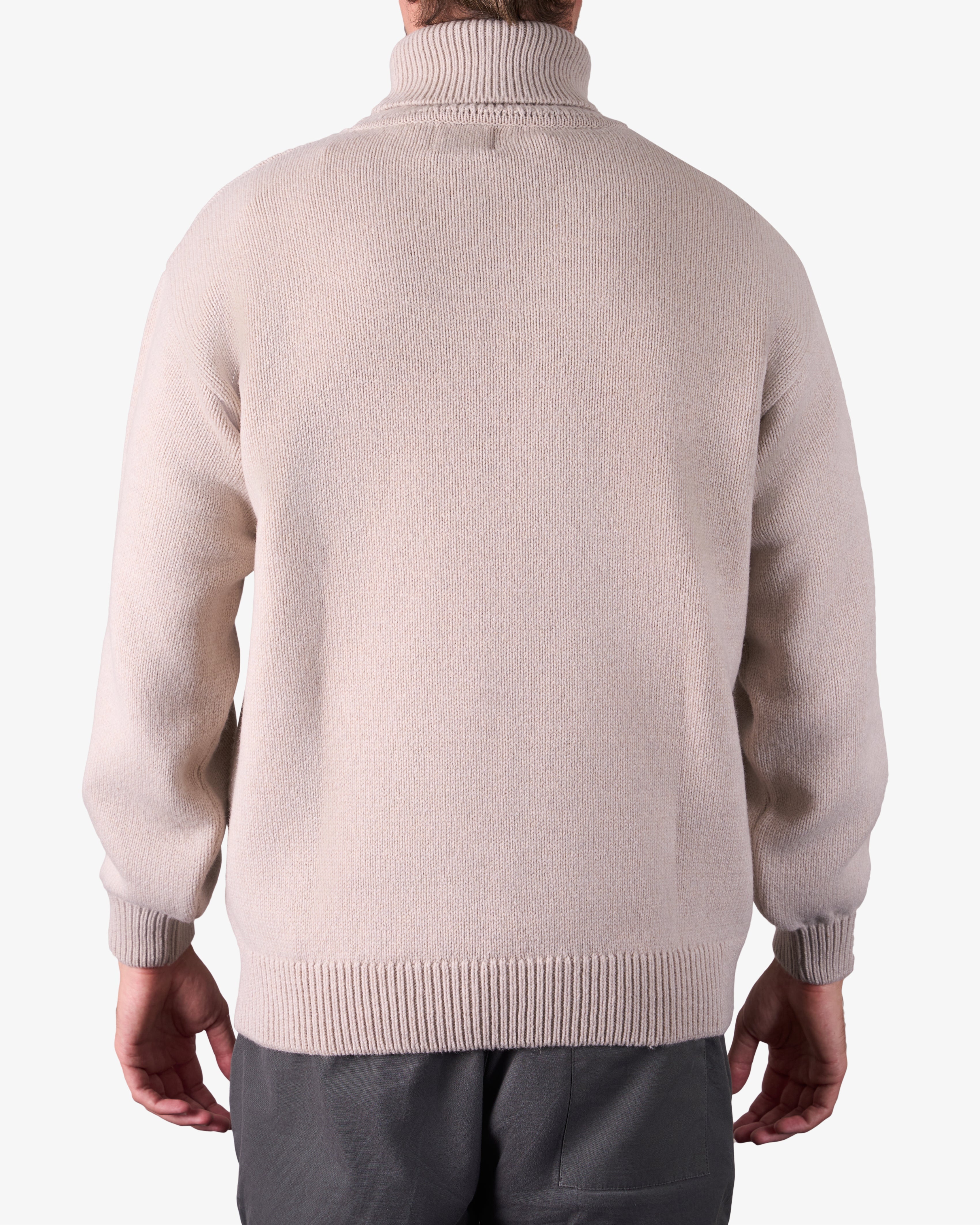 The Recycled Merino Wool Turtleneck features a relaxed fit with a ribbed neck, hem, and cuffs, adding a modern touch to a classic design. The high turtleneck provides extra warmth and a sophisticated look, making it a versatile choice for any occasion.